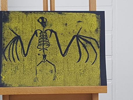 De textuur van de afdruk is een beetje ruw door de opliggende inkt. Ik heb het skelet centraal van het papier gedrukt in een dynamische vorm.